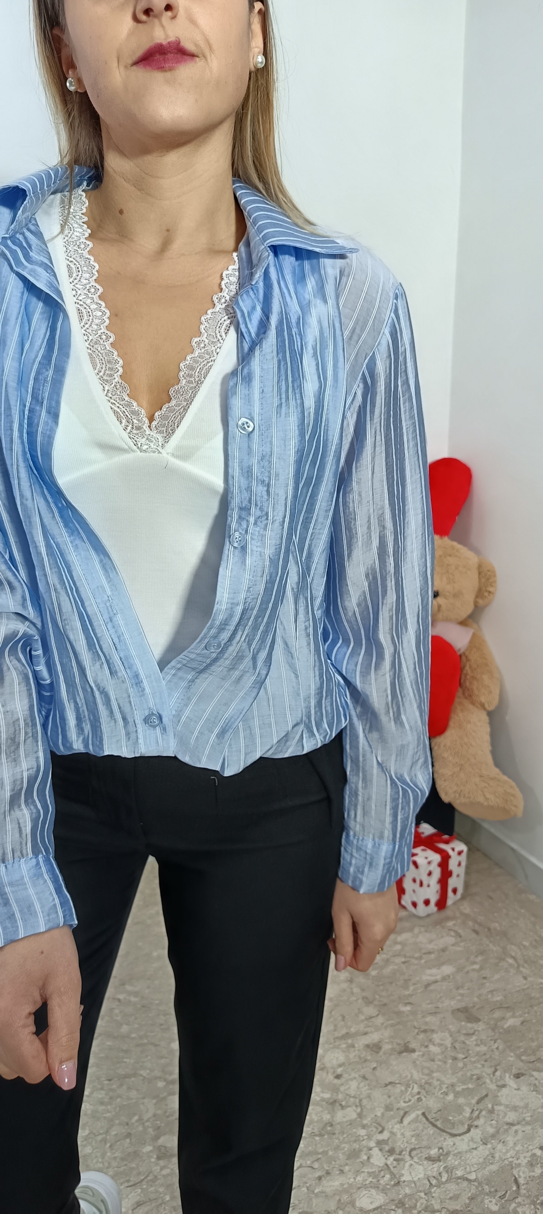 La Camicia Flavia Due in Uno combina una canotta con dettagli in pizzo e una camicia sopra abbinata, offrendo un look versatile adatto per diverse occasioni. Questa soluzione due in uno ottimizza lo spazio nel guardaroba e facilita la pianificazione dell'outfit, garantendo comfort e stile in un solo pezzo.